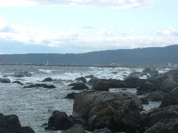 | 室戸岬近くから見た岬港周辺の大波 遠くの岸壁が港の防波堤。宿の近くから海岸沿いに遊歩道があり、岬の先端まで歩いた。 |
