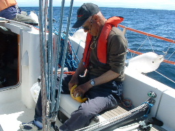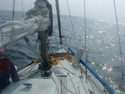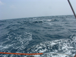 ・昨夜の予報は一日穏やかと言っていたが、昼前には風が吹く出すことを想定して、6時に出港した。 昨夜遅くまで風が強かったのが港の中は幾分か静かになっており、予報とおり穏やかな航海かと思っていた。 港外に出ると追い風になる北西6〜10m/sが吹いており、波も穏やかに見えたので、先ずジブセールを開き始めた。 途端に12〜13m/sの強風が吹き始め、ジブも全部出すとブローチングし出したので、慌てて少し小さめにした。 ・「やはり今日も静かな一日にはならないね!」と言い合い、気を引き締めてオイルスキンとライジャケをしっかり着込んだ。 針路は、北西の風なので風位120度くらいが周参見港の針路であったが、風が北から北東に変わることも想定し、 風位100度で田辺と周参見の中間に針路を取った。 ・6:30に風速が18m/sになり、波高も2〜3mと高くなって飛沫がかかり始めた。 風と波に翻弄され始めたのでジブを小さく下(130%ジブを100%くらいに小さく)。 ・8:30には日和佐から16NMの地点まで進み、9時頃には四国の山並みが見えなくなってきた。 9:25時頃紀伊半島の山並みが見え出し、紀伊半島の山が四国側の山より標高が高いから、 紀伊半島の山は約25NM離れていても見え始めたのだろうと推測した。 ・10時には周参見まで約20NMの地点に到達したので、もう風向も大きく変わることは無かろうと、風位を 140〜150度に落とし、追い風をけ受周参見に針路をとった。 ・11時頃紀伊水道側の本船航路に入り、タンカーやコンテナ船の間を縫って進んだ。 12時頃、周参見から約6〜7NMの地点に到達。岸に近付くに従い波・風が治まってきて、 風速も10m/s前後、波高も2m前後になり、飛沫も被らなくなった。 ・13:30に周参見港の岸壁に舫って、遅いお昼を食べ、ビールを飲んで一息ついた。 岸壁には伊東から来たと言う「ちひろ号」が停泊しており、色々話しているうちに「ちひろ」の艇長さんは 「あうん」の林さんと九里さんにヨットを教わったとのことで、世間は狭いものだとお互い言い合った。 |