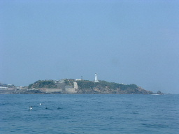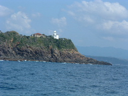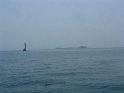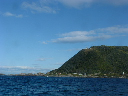 | 尾鷲港から朝日に輝く海面に向かって出港した。 | 布世田水道にある水路標識と小島。先日は大荒れの中、この沖合いを通過した。 | 大王崎も先日と異なり穏やかな表情を見せていたが、波切漁港沖合いには3個もの定置網が張ってあった。 |