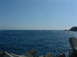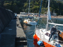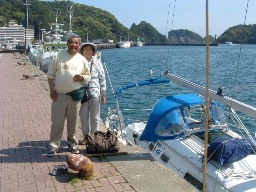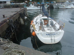 | 周参見港には先客(ちひろ号)が舫っていた。「ちひろ号」の艇長さんは 「あうん」の林さんと九里さんにヨットを教わったとのこと。世間は狭い! | 今日も一日波浪に翻弄され、疲れきって港に入った。 入港して港外を見ると波も治まったように静かな姿を見せていた。 |