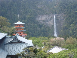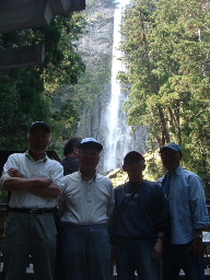 那智の大滝と三十の塔。絵葉書にも出て来る光景を眼にした。 | 左の写真に航海のメンバーを重ねた (左から国弘、名田、浜田、小宮、 中倉) |