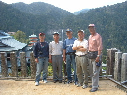 内宮本殿への階段下で記念撮影。 左から:中倉、名田、国弘、浜田、小宮。 |