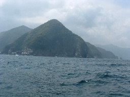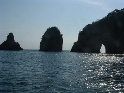| 勝浦港の入り口にある景勝の岩礁群。岩礁の隙間を観光船がすり抜けていった。 | 尾鷲湾の外、九木崎沖は海流が強く風も弱いのに三角波が立っていて、飛沫を飛ばしてくれた。 | 尾鷲湾内で海上保安庁の巡視艇が「海猿」と思わしき若者達の訓練をやっていた。 |