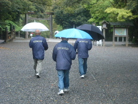 | アルバのウィンドブレーカーを着て 内宮本殿へ向かう小宮、国弘、浜田(左から) |