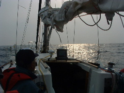 尾鷲港は東に開いているので、針路を朝日に向けることになり、朝日に輝く海面に針路を取った。 6:30に桃頭島灯台沖を通り外海に出たが、風も弱く波も無く静かな海面が広がっていた。 ・尾鷲湾の入り口の岩礁地帯を回ると、大王崎に針路を取った。段々日差しが雲に隠れ始め、 東の空には明るさがあったが、西の空は黒々とした雲が出ており、天気は下り坂だと思わせる風景だった。 視界も約5NM位で沖合いに行くに従い陸地が直ぐぼやけてきた。 ・肌寒さを感じながら機走にて進み、8時にコーヒーを飲んで身体を暖めた。 10時頃から薄日が差し始めやや暖かさを取り戻してきた。 何度か赤潮の帯を通過したが、その度に流れ藻も帯をなしており、皆で流れ藻を見張って、スクリューに絡まないよう用心して進んだ。英虞湾の外海側にある布世田水道手前が最も赤潮がひどいところで真っ赤な帯が幾重にも連なっていた。 ・布世田水道を通ることにして、先日大荒れの中、大王崎から三木浦に進んだ航路をGPSで照らしながら進むと、 先日のコースはやはり岩礁地帯を突っ切って行ったことが分った。布世田水道の沖側に位置する小島付近は大きな白波が砕けていたが、 水深が浅いところは3m位で周辺も10m以下と浅く、荒れた天気では航行できない水域であることを確認した。 先日は知らぬが仏とも言えるが、砕け波が無いところを通過したので一番安全だったかもしれない。 また、布世田水道沖の竹林は総てが網と言うわけではなく、通れる場所がたくさんあることも確認した。 布世田水道には潜りをやっている船が沢山出ていて、竹林のある沖合いに追い出されることもあった。 ・12時頃大王崎灯台沖を通過し、安乗港に針路を取った。大王崎灯台近くの波切漁港沖には3個の定置網があった。 先日波切漁港に入港した際、大荒れの中定置網も見えずに無事入港できたが、 これはメインセールを2ptリーフしてポートタックでの真追っ手だったことと、大王崎灯台を目標に針路を取った結果、 大王崎の南方面から入港したから、港の東に設置してある定置網には遭遇しなかったためであろうと思われた。 ・13時に安乗崎の灯台を回航し、漁港に入り13:20に地元の人の案内で着岸した。 今晩宿泊する旅館の案内する漁港内の場所は水深が浅く停泊できず、岸壁の外側に繋留した。 |